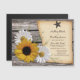 Rustiska solrosor och daisy bröllop spara datum-magnetkort. Det här är en underbar solros och daisy bröllop spara datum-magnet om du har ett orustiskt, westernt eller land. Det finns en gammal bakgrund av tittar träkärnor parad med en gult solrosa och vita blommor av daisy. Det finns också vintage Parchment stil papper med en western stjärna som fäster den på skogen.