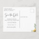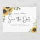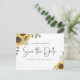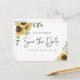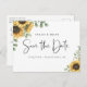 Elegant solrosolja och eukalyptus-arrangemang, bröllop spara datum vykort. Kortet har elegantens calligrafi "Save the Date" (Spara datum), på framsidan och baksidan.