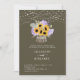 En blomkruka av bark från träd, fylld med en lush bouquet av solblommor, lavender, vete och baby andedräkt, samt vattendrag, ger en vacker illustration, handmålad i den digitala vattenfärgen, som dekorerar denna rustiska inbjudan från elegant bröllop, som också har en strålande bakgrund med guld och strängar av ljus. Romantiskt och charmigt, det är ett underbart val för en lada bröllop, en utomhusbostad bröllop, ett trädgårdsbröllop eller någon annan rustik miljö.