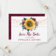 De här sparar datumkorten med rustiska solrosor och burgundisk ro-design med sträng ljus. De ingår i en samling som innehåller en fullt av matchande bröllopsinbjudningar och papper. Besök vår butik för att se det sortiment av objekt som du kan anpassa till bröllop.