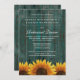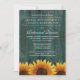 Rustic Solros Rehearsal Middag Inbjudan - har en nedtryckt turkos-/barkbakgrund med russolblommor vid grund.
