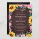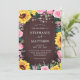 Dessa bröllopsinbjudningar har en vattenfärgad blommigt gräns av solblommor, rosa ros och löv på en träbakgrund med glanssträng ljus. Anpassa dem med din egen text. Besök vår butik för att se det sortiment av objekt som du kan anpassa till bröllop.