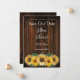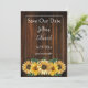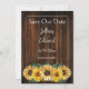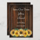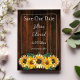 Anpassa ett unikt bröllop-meddelande med en Rustic Solros Spara datumet. Meddelandedesign har en bakgrund av rustiskt trä med en elegant av solblommor. Ytterligare spara datum meddelande som är tillgängligt för den här konstruktionen i en mängd olika färg.