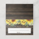 Rustic bröllop har vikt platskort med gult solblommor och vattenfärgade vilda blommor med stringorna ljus och bakgrunden av mörk lada.
