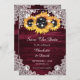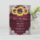 Burgundy- och solroskort från bröllop spara datum med solblommor och vit blommigt snöre mot bakgrund av rustiskt trä. Matchande objekt är tillgängliga.