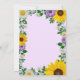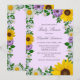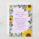 Rustic land-babyduschinbjudan med vibrerande solblommor, traditionella vita daisy och färgstarkt lila blommor mot en ljus lila bakgrund med baby utandning och botaniska gröna accenter