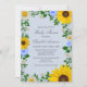 Rustic land-babyduschinbjudan med vibrerande solblommor, traditionella vita daisy och färgstarkt blåa blommor mot en lätt dammig blå bakgrund med baby utandning och botaniska gröna accenter