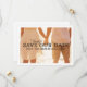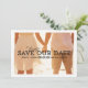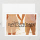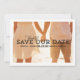 Den här roliga, visuella sparandet av datumet för vykortet innehåller texten "Vänligt spara vårt datum" i mitten på kortet, som täcker ett stort foto. Anpassa med information om bröllop och favoritfoto. Ytterligare foton och text kan läggas till på kortets baksida.
