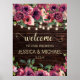 Bröllop välkomstbanderoll/skylt med en rostfri lingträdsutformning med strängen ljus och rosa och blommigt med burgudfärgad vattenfärg.