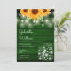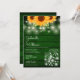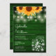 En snyggt rustik bröllopsinbjudan med söt solblommor, ljus och burk. Lycklig parets namn är uppfört i ett elegant som ligger ovanför de speciella bröllop-detaljerna på en rustik emerald grönt-träbakgrund. Den omvända funktionen har din monogramuppsättning initialer inom en motsvarande solros. Designad av Thisisnotme©