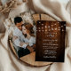 Den här roliga bröllopsinbjudan har en varm, trätexturerad bakgrund med mjukt glödande ljus, som skapar en mysigt och romantisk ambians. Eleganten med handskrivet skript och sans-serif typsnitt tillför en aning charm och sofistikering, skapar perfekt för ladan, land eller utomhusbröllop. Mörkens träkornigdesign förbättrar kontrasten för den skarpa vita texten och säkerställer läsbarhet samtidigt som man bibehåller ett estetiskt chic. Baksidan har ett foto av paret i förlovningen. Idealisk för att par ska planera ett fall, ett bondhus eller ett skogsinspirerat firande, anger denna inbjudan på ett vackert sätt tonen för en intim och snyggt bröllopsdag.