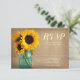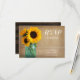 Landsbyggsbröllopets OSA kort. Konstruktionen har solblommor i burk med blå mason med mörk lada på baksidan av inbjudan.