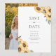 Announce your upcoming wedding with this rustic sunflower save the date card. It features elegent corner watercolor florals on a crisp white background. Personalize with your photo on the back. This design is perfect for couples planning a late summer or fall / autumn outdoor garden ceremony with a country chic botanical theme.