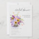 En bukett av lush hydrangeas, solblommor, lavender, vete, baby andedräkt, ivy och ranunculus blommor ger en vacker illustration, handmålad i digital vattenfärg, som dekorerar den orustiska eleganten inbjudningskort för möhippan. Romantisk och charmerande, det är ett underbart val för en lada-möhippa, en utomhusmiljö, en möhippa för trädgård eller trädgård eller någon form av rustika.