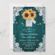 Rustic teal bröllopsinbjudningar med solrosbukett inuti en mason burk mot en teal lada-bakgrund som är försedd med vit blommigt snöre och sträng ljus. Utformning av perfekt för att bjuda in dina gäster till bröllopsfesten för rustik teal inspirerad av solblommor. Fullständig utformning av anpassadet. Matchande objekt är tillgängliga.