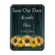 Meddela din kommande bröllopsdag för familj och gäster med en Rustic Teal Solros Spara datum magneter. Magnetkonstruktionen har en rustik träbakgrund med en elegant av solblommor. Anpassa till namn i brudgummen och till bröllop-datumet. Ytterligare bröllop-kontorsmaterial och presenter som finns tillgängliga med den här utformningen också.