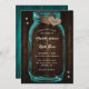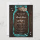 Anpassningsbar Rustic teal bröllopsinbjudan med en mason burk och burlap-hjärtan med initialer på en lada-träbakgrund. Anpassa enkelt det här teal-bröllop-kortet med dina bröllop-uppgifter.