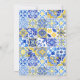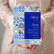 Den här skorstenskonstruktionen har en bakgrund mönster av blå, vit och gult vattenfärg för portugisiska plattor. Anpassa den till namnen på briden och trimmen i marint blått kalligrafi-skript och den återstående texten i en kombination av sans serif, copperplate och italics på en vit rektangel som är justerad mot högerna kant på kortet. En matchande ruta mönster visas på baksidan.
