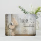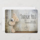 Ett kort med ett foto av en söt stoppad björn, som står vid en rustisk trävägg/bakdel.