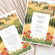 Transport your guests to the sun-drenched hills of Italy with this breathtaking wedding invitation suite. The design features a stunning, hand-painted illustration of a pastoral Tuscan landscape, perfect for a destination wedding or a rustic vineyard celebration. The artwork showcases rolling fields of golden wheat and vibrant yellow sunflower fields stretching toward the horizon, punctuated by iconic, tall dark green cypress trees. In the foreground, a charming meadow of bright red poppies and delicate small yellow wildflowers frames the event details, adding a splash of romantic color.