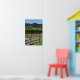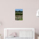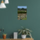 Den sceniska Rustic Vineyard Grape Fält Poster Print har ett landskapsfoto av stora fält druvor som odlas i backe och vin land i Napa Valley, Kalifornien med ett rostfritt vävt trästängsel i förgrunden en sommardag i blå himmel.
