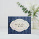 Det här sparar datumkortet med en dammig blå bakgrund där ett mörkare blått band bär en vit symbol med skalat kant. Den här kurvformade, symmetriska formen, som ser ut som en papper urklippning, ramar på ord "Spara datum!" med ett snabbt skript blomstrande på framsidan och några enkla detaljer om bröllop (anpassade!) skrivna i klassiskt skript och Garamond typsnitt på baksidan. Konstruktionen har en bekymmersam vintage och åldras som kompletterar temat enkel, gammaldags elegans.