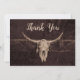 Det här platta tackkortet har ett strålande brunt struktur-skalle av westerna land rodeo cowboytema bröllop. Stil, gammal vilda western vintage antique. Coola, trendig, modern utformning av jordbruksdjur. Upphovsrätt Marg Seregelyi Fotography.