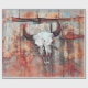 Rustic western rodeo-bull-skalle land grunge struktur blommigt boho solblommor frisipprande med papper rullning. Vintage rostar bruna trälador. Farmhouse cowboy stil är en formad presentförpackning. Upphovsrätt Marg Seregelyi Fotography.