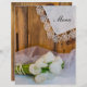Den charmerande Landsbyggsbröllopet Rustic White Tulips Menu kan vara personlig med detaljerna i den måltid som du kommer att vid middagen för möhippan i mars, april eller maj, vid middagen för vårtiden i giftermål eller efter bröllop brunch. Den här avslappnaden, som ändå har en western anpassningsbar i klassrummen, har ett fyrkantsfotografi av en bukett av vita blommar av tulpanblommor, vit halshalsband, möhippa slöja och en vintage snöre-trimmad linnäsduk med brunt lingerjord.