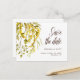 Det här vackra och snyggt bröllop spara datum-vykortet har en söt vattenfärgad vildblomsklass med gula blommor och manustypografi. Se hela samlingen "Rustic Gult Wildblomma Bröllop Suite" nedan.