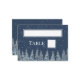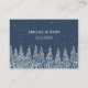 Winter wedding table place setting cards rustic country forest at night covered in snow in navy blue and white.
