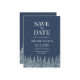 A rustic save the date card for your winter wedding with a nighttime snow covered forest in navy blue and white.