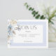 Vi presenterar vårt krävande bröllopskort för vintern blommigt, ett firande i kärlek mitt i årstidens förtjusande skönhet. Med sin isig blå och vit dubbla ram är denna inbjudan elegant och sofistikerad. Mjuka blåa och vita blommigtar på vintern, med delikata beröringspunkter av gult, tan och grönt, skonar de motsatta hörnen av den pristina vita textrutan. Tillsammans med flytande rosett band symboliserar de det odelbara bandet mellan två själar. När du vänder inbjudan visar baksidan en kompletterande isig blå bakgrund, något bedrövad med vitt, som visar en harmonisk blommigt av vattenfärg som kompletterar framsidan med skoningslös nåd. Förbered dig på att fånga dina gäster med den här fantastiska inbjudan, en återspegling av kärlek blomstrande resa mitt i vintern. Den poetiska blandningen av färg och konstverk är ett steg för ett bröllop firande som kommer att omhuldas som ett tidlöst mästerverk. Bär säsongens magi och inbjudan era kära för att gå med er på den underbara resan kärlek och lycka. Den här designen är en del av Rustic Winter Frosty Blue & White Blommigt bröllop-sviten skapat av enbart Farmhouse Press.