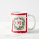 anpassningsbarna helgdag kaffekaffe i elegant har en mugg med rustiska bärgningar i chicen och vintern vattenfärgsgrönt som bildar en första eller sista benämning i monogrammet. Anpassa med ditt val av rött brev. Tvåsidig design visas på framsidan och baksidan av mugg.