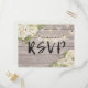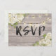Bröllop OSA Svara vykortsmallar - Faux guldfärgat skript med Vit ros Blommigt och String Ljus på Rustic Wood Background. En Perfekt för din stora dag! Alla textstorlekar i Stil, Färg kan anpassas efter dina behov.