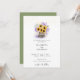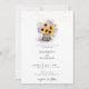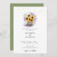 En blomkruka av bark från träd, fylld med en lush bouquet av solblommor, lavender, vete och baby andedräkt, liksom vattendrag, ger en vacker illustration, med en handmålad färgad digital vattenfärg, som dekorerar denna rustiska inbjudan från elegant bröllop som också innehåller strängar av ljus. Romantiskt och charmigt, det är ett underbart val för en lada bröllop, en utomhusbostad bröllop, ett trädgårdsbröllop eller någon annan rustik miljö.