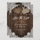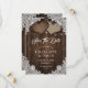 Komplettera din romantiska, rustiska bröllopsfest med dessa vackra brickor och snöre bröllop spara datum-kort med två burlap-hjärtan på en lada-träbakgrund som dekoreras med strängen ljus och vit blommigt snöre. Matchande objekt är tillgängliga.