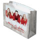 Ett modernt Helgdag i julafton med en rustik bakgrund av trä och ett rött typografiskt skript "God jul" som täcker och dekorerar snöflingor och bokeh. Du kan enkelt ändra exempelfotot med ett eget.