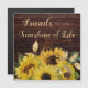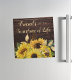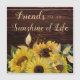 Kylare, magnet-hälsningskort för en vän med en rustisk mörk brun trädesign, dekorerad med ljusa solblommor i gult och ett visstiskt skript, "Vänner är livets solsken".