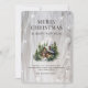 Vattenfärgskort med en helgdag i skogen med en logaritmisk träbakgrund som är dekorerad med snöflingor. Anpassa enkelt det här helgdag-kortet med din familj namn och text.