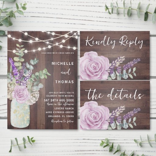 Rustik bröllopsinbjudan, med originalteckningar av vackra blommigtar, ro, lavender och eukalyptus arrangerade i en vintage Mason Burk. Alla ordnade på en trädbelagd effektbakgrund med mousserande ljus. Anpassa enkelt för att skapa perfektens inbjudan till ett fullbokat bröllop.