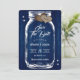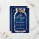 Rustic marinblått bröllop spara datum-kort med en mason burk och burlap-hjärtan mot en lada-träbakgrund. Anpassa enkelt denna romantiska, roliga marinblåa bröllop spara datum-online. Matchande artiklar som är tillgängliga för att komplettera detta marinblått bröllop spara datum-kort.