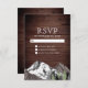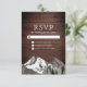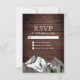 Elegant rustiskt bröllop OSA-kort med vackra berg med tak över snö och gräs träd med modern typografi mot en lada med träbakgrund.