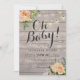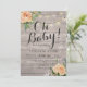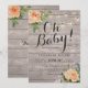Inbjudningskort för babyskor - Faux guldskript med Peach Vit ros Blommigt och String Ljus på Rustic Wood Background. Alla textstorlekar i Stil, Färg kan anpassas efter dina behov.