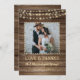 Fotot från bröllop är accentuerat med bakgrund av rustik, land, brunört träplank och mjuk gult, ljus tillsammans med titeln KÄRLEK & THANKS och ditt bröllop-datum i ett westernt land-tryckt teckensnitt och ditt namn i ett krypstil. Baksidan har samma baksida av träplank och ger ställe möjlighet att skriva ett allmänt tackmeddelande (eller ta bort provtexten om du vill lämna blankt om du vill ha egna handskrivna tackmeddelanden). PHOTO TIP: För snabbaste/bästa resultat väljer du ett foto med subjekt i mitten och/eller före skörd till kvadratisk form före uppladdning. Kontakta designern via Zazzle-Chattan eller makeitaboutyoustore@gmail.com om du vill att designen ska ändras eller om du vill ha koordinerande element.