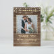 Fotot från bröllop är accentuerat med en rustik, land, brunt vättat träplank och mjuk gult glöd ljus tillsammans med titeln på TACK och ditt bröllop-datum i ett land-westernt handtryckt teckensnitt och ditt namn i ett grovt penselskript. Kortets baksida har samma baksida av träplank och ger ställe möjlighet att lägga till ett förtryckt tackmeddelande (eller ta bort provtexten om du vill lämna blankt för personliga anteckningar av tacksamhet). PHOTO TIP: För snabbaste/bästa resultat väljer du ett foto med subjekt i mitten och/eller före skörd till en kvadratisk form FÖRE uppladdning och fyller i fotoutrymmet perfekt. Kontakta designern om du vill ha någon anpassning eller koordinering.