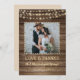 Fotot från bröllop är accentuerat med en rustik, land, brun, avvanda träplank och ljus med mjuk gult, med titeln KÄRLEK & THANKS och ditt bröllop-datum i ett land-westernt handtryckt teckensnitt och ditt namn i ett krypteringsskript. Med baksidan kan du skriva ett generiskt tackmeddelande i ställe eller ta bort exempeltexten för att lämna området tomt för personliga, handskrivna anteckningar om uppskattning. PHOTO TIP: För snabbaste/bästa resultat väljer du ett foto med subjekt i mitten och/eller före skörd till en kvadratisk form FÖRE uppladdning och fyller fotot perfekt. Kontakta designern om du vill att designen ska ändras eller om du vill samordna objekt.
