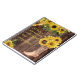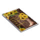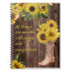Bärbara spiral-datorer med rustiskt trä från land-stil, solblommor och cowgirl-skor. Lustigt citat säger: "Allt sak är möjligt med kaffe- och cowgirl-skor."