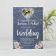 Den vackra inbjudan till Rustic Romantic Wood Twinkle Ljus Photo Blommigt innehåller en rustik skifferblå träbakgrund med rosa och vita blommor, med bara en liten bit lila, som markeras med ett foto av bruden och groomen i dubblans hjärta. Kammusslor är en perfekt som åtföljer de vackra blommorna. Ett bra designval för att ange tonen för bröllop firande. Om du vill ha en designfråga eller ytterligare anpassning och/eller matchning av objekt kan du skicka ett e-postmeddelande till charmdesignstudio@rcn.com så hjälper vi dig gärna. Visa samlingslänken på den här sidan om du vill se alla matchande objekt i den här vackra designen.