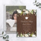 En inbjudan till elegant rustik studentfest med vit blommigt vattenfärgsinslag på en faux träbakgrund, med foto på baksidan. Copyright Elegant Inbjudan, alla höger reserverade.
